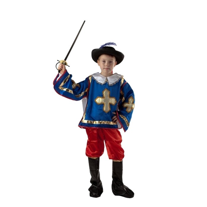 Карнавальный костюм «Мушкетёр» - костюм для настоящего героя! Бесподобный, легкий, яркий костюм очень удобный и нисколько не помешает играм ребенка. Воинственность образу придаёт длинная шпага. Завершает образ смелого мушкетёра головной убор с широкими полями. Праздничный костюм «Мушкетёр» - костюм для смелых и отважных! Он порадует Вашего ребенка, подарит множество фантазий о приключениях, подвигах, сражениях с гвардейцами кардинала.