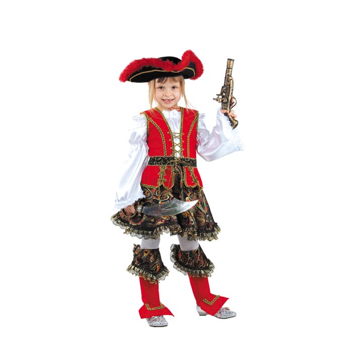 Детский маскарадный костюм «Разбойница» - это красивый элегантный наряд для маленькой неугомонной проказницы. Он создан для Вашей девочки, с учетом подвижности и особенностей детской фигуры. Он подойдет к любому празднику, запомнится всем гостям и приведет в восторг Вашу малышку. Наряд романтичной пиратки, бесстрашной, находчивой завоевательницы сокровищ далеких островов состоит из белоснежной блузы с широкими рукавами, красного жилета на шнуровке, расшитого золотом, перетянутого красивым ремнем, широкой красочной юбки, затейливых высоких сапог и невероятной треуголки. Девочка легко вживется в образ красавицы пиратки. Вы будете рады видеть свою дочь счастливой.