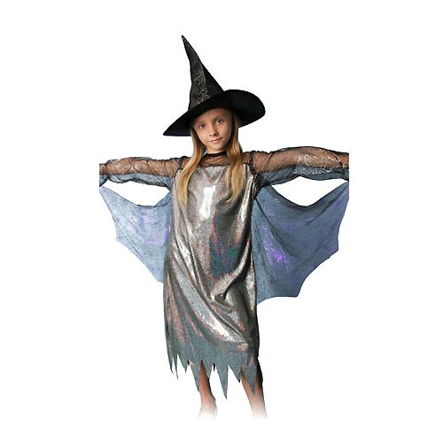 Совершенно неожиданный, яркий детский маскарадный костюм. Можем ручаться, что Ваш ребенок будет в центре всеобщего внимания на тематическом празднике, всех торжествах и семейных праздниках. Само платье очень интересное, оно сочетает в себе блеск, разноцветные искры, неровный обрез подола, полупрозрачные рукава и плащ. Но изюминка этого костюма, конечно, в остроконечной шляпе. При этом костюм очень удобный и не сковывающий движений.