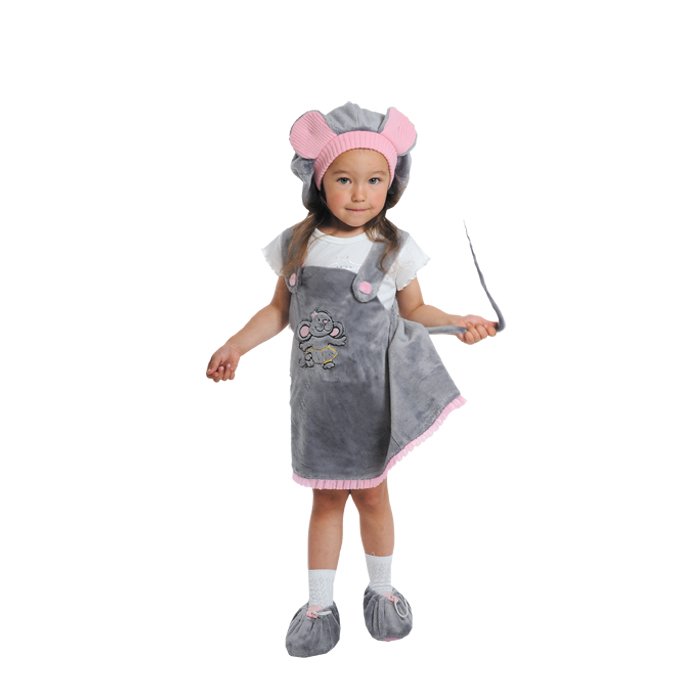 Очаровательный детский карнавальный костюм «Мышка» будет замечательно смотреться на любом празднике. Яркие насыщенные цвета, высококачественные материалы, удобный крой и необычный образ сделают праздник незабываемым. Серый сарафан с розовой каймой и вышитым мышонком, берет с очаровательными розовыми ушками, ботиночки-носочки - все детали костюма очень мягкие и приятные на ощупь.